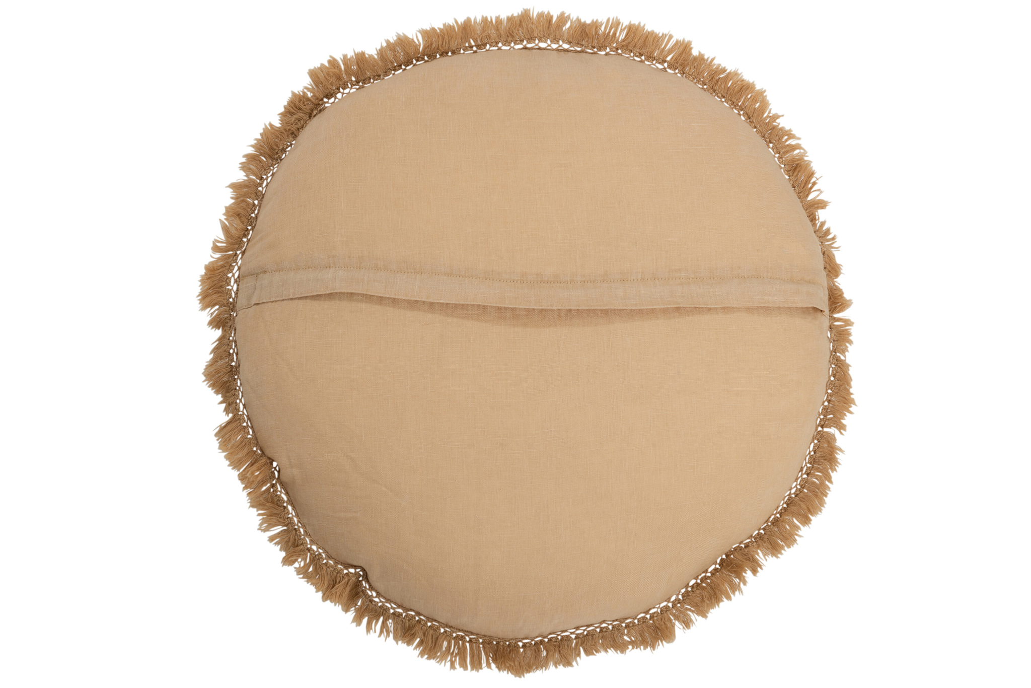 Dieses elegante, runde Kissen aus einer Mischung von Samt, Baumwolle und Leinen in Beige/Ocker vereint Komfort mit stilvollem Design.