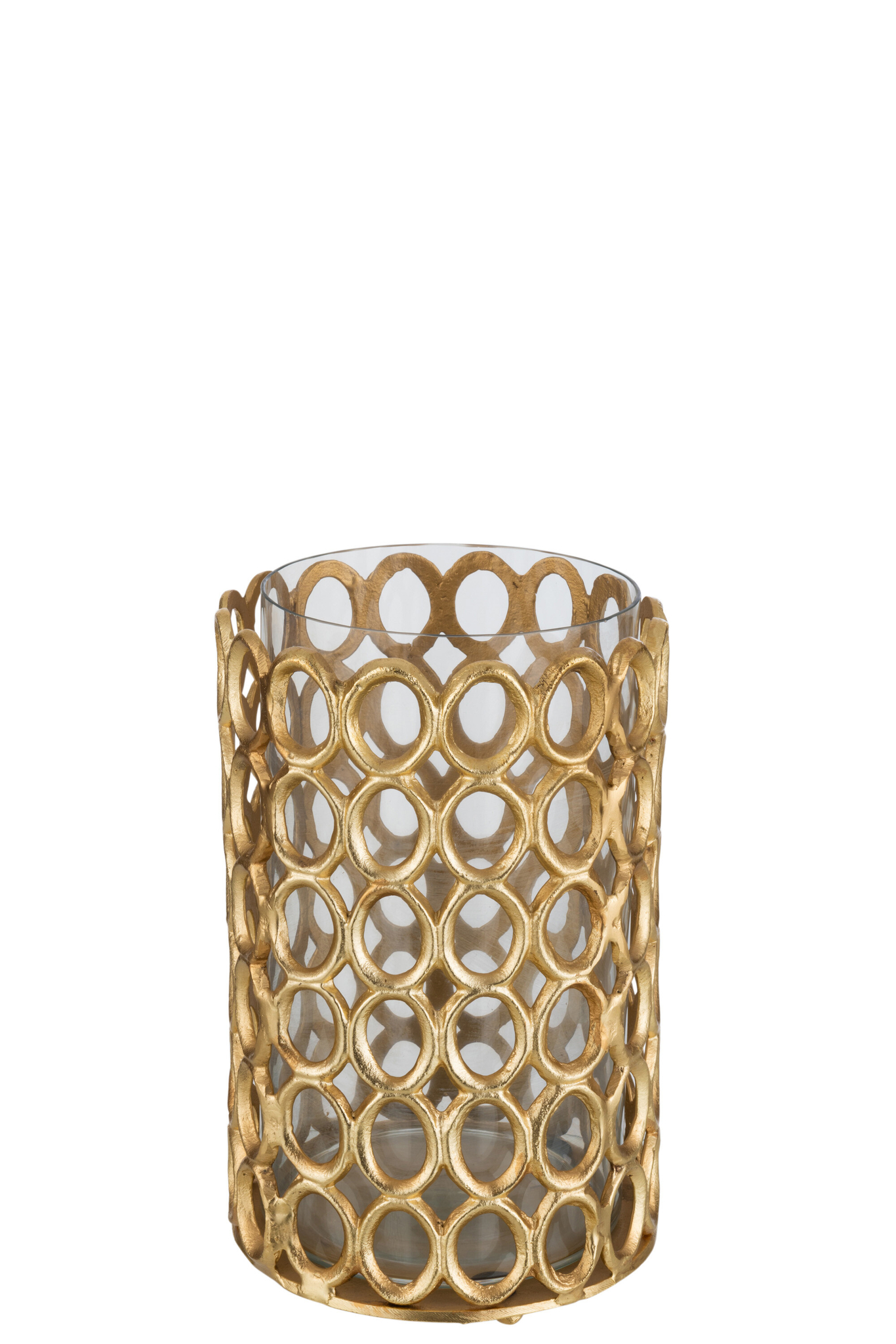 Setzen Sie Ihre Teelichter stilvoll in Szene mit dem großen Teelichthalter aus Aluminium in Gold. Das elegante Design mit runden Ringen verleiht jedem Raum eine edle und raffinierte Note.