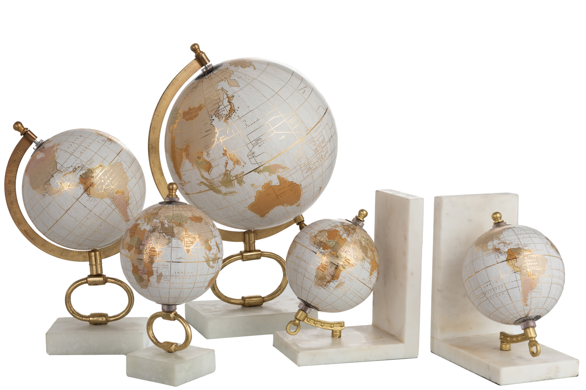 Dieser elegante Globus auf Fuß in Marmor Weiß und Metall Gold ist ein luxuriöses Dekorationsstück für Wohn- oder Arbeitsräume. Mit den Maßen 23 cm Breite, 36 cm Höhe und 24 cm Länge sowie einem Gewicht von 1,6 kg ist er kompakt und gleichzeitig ein auffälliges Highlight.